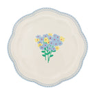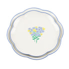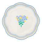 A charming bouquet of periwinkle and sunflower-yellow blossoms atop a verdant stem and set against a white canvas. A pastel blue scalloped rim with delicate loops, reminiscent of vintage lace, frames the bouquet, evoking hints of classic Italian and French ceramics. It's a modern nod to beloved European styles, perfect for appetizers or the first course.
