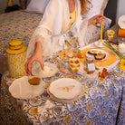 A solitary bumblebee, intricately sketched, claims a central place on a white scalloped plate. Whether it's a sunlit breakfast or a candlelit dinner, this plate - a prelude to the 'Bumble Voyage' dinner plate - brings a touch of summer's fleeting beauty and the tireless dance of the bumblebees.