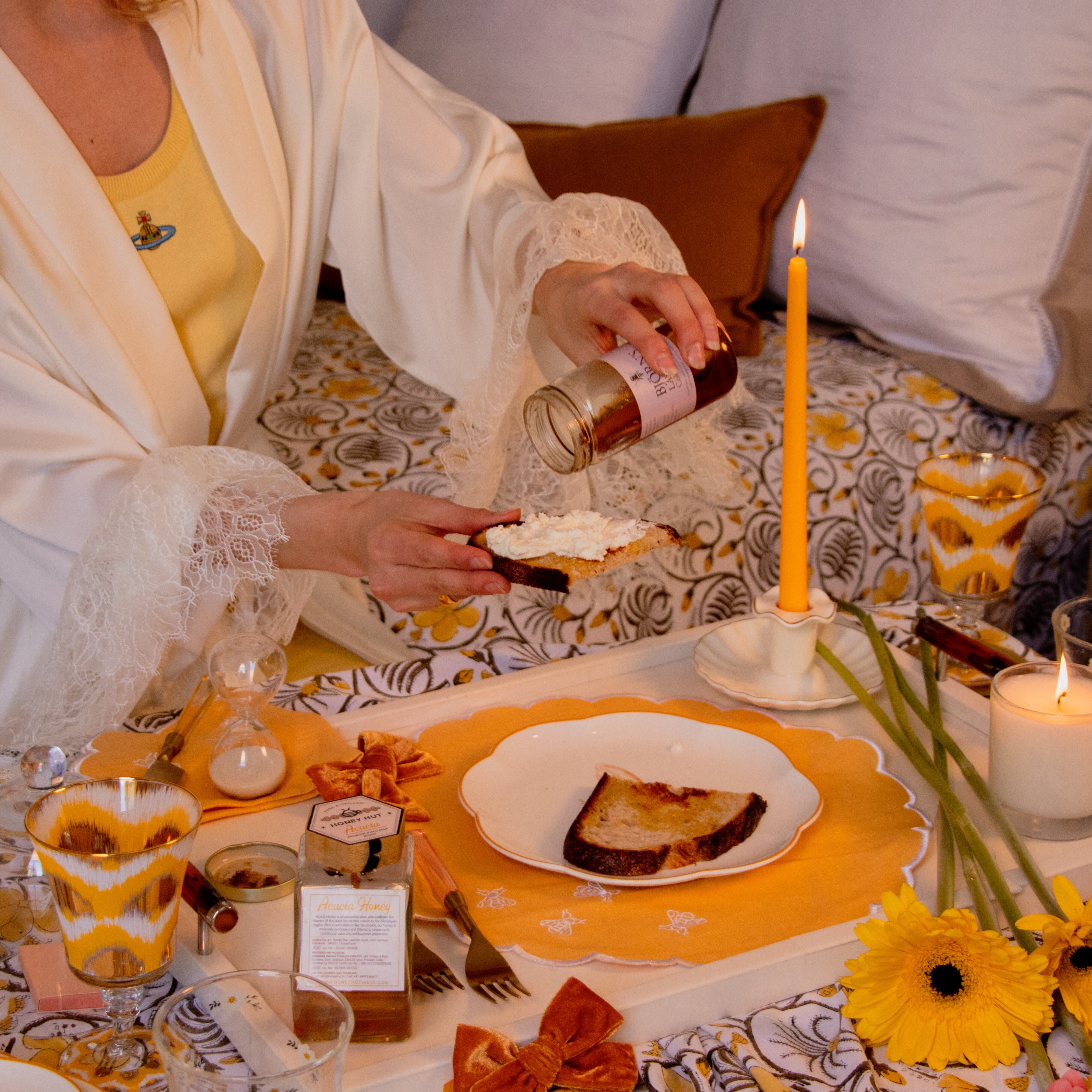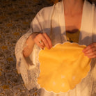 Add our Bumble Voyage Napkin for a playful addition to your table. Crafted in honeyed yellow linen with a crisp white trim, it features charming bees taking a voyage. Perfect for adding a touch of whimsy to any dining occasion. Pair it seamlessly with our coordinating placemat.