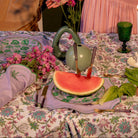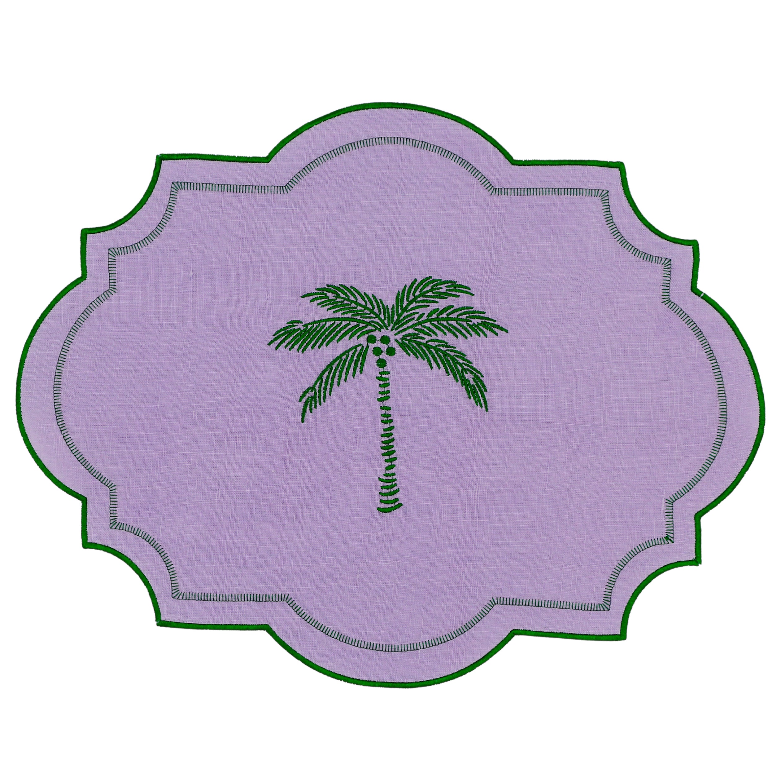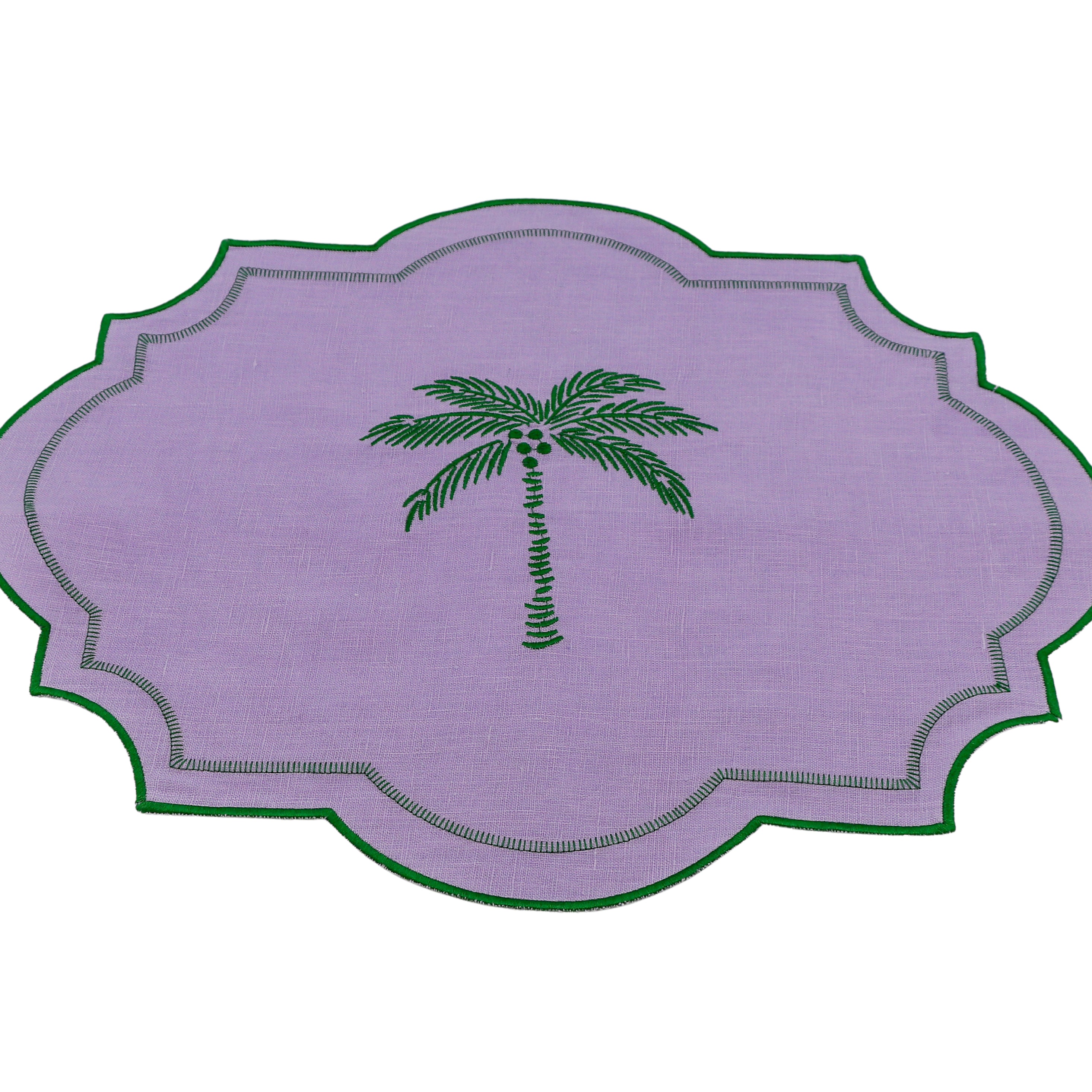 Indulge in the opulence of a bygone era with our Jewelled Mirage Placemat. Exquisitely crafted from lilac linen with emerald green embroidered edging and a palm tree motif. Pair it seamlessly with our coordinating tableware to curate a captivating setting that transports you to a bygone era of timeless charm and the enchanting allure of our Vintage Palm collection