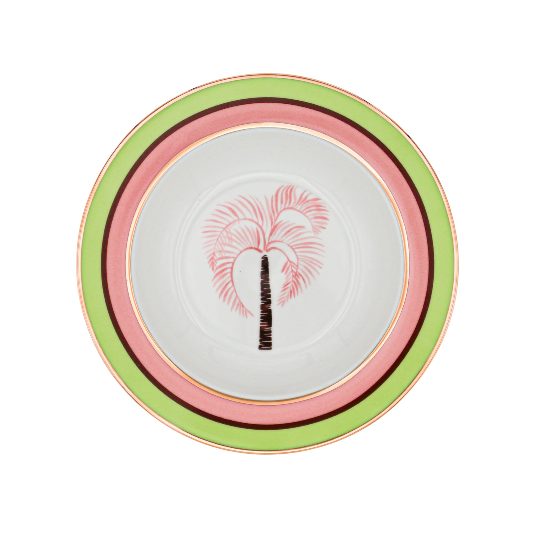 Dive into a dreamscape of yesteryears every time you indulge in your favorite soup or pasta. This bowl boasts a hand-painted blush palm tree and chocolate brown stem, intricately illustrated as if swaying with the breeze. Gold outer rim complemented by inner rings of pistachio, blush, and chocolate brown encircle the bowl edge. Designed for the contemporary soul who cherishes throwback aesthetics.