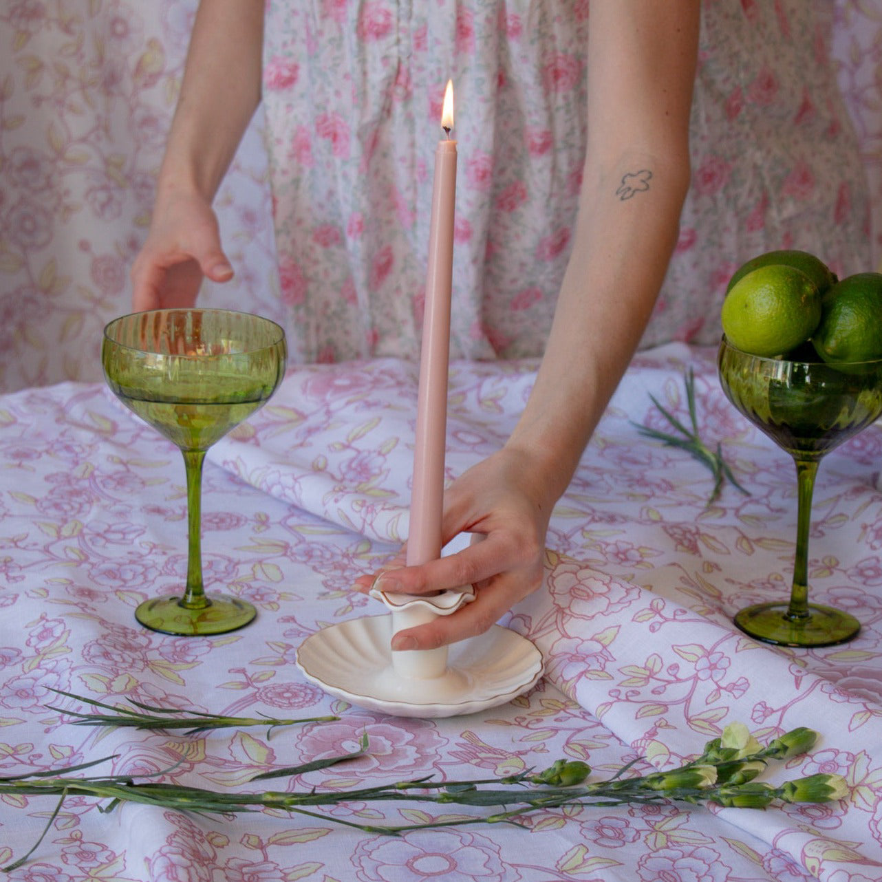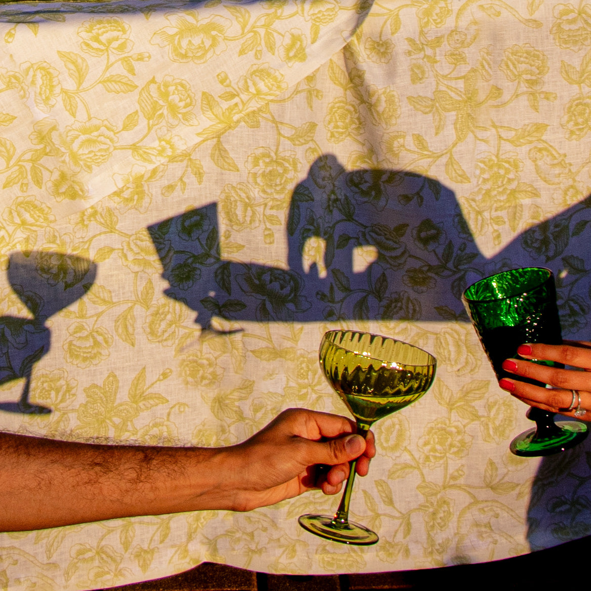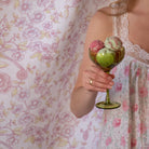Hand-blown from textured glass, boasting an external ribbed design with a distinctive stem. Its muted green hue is reminiscent of a bygone age.