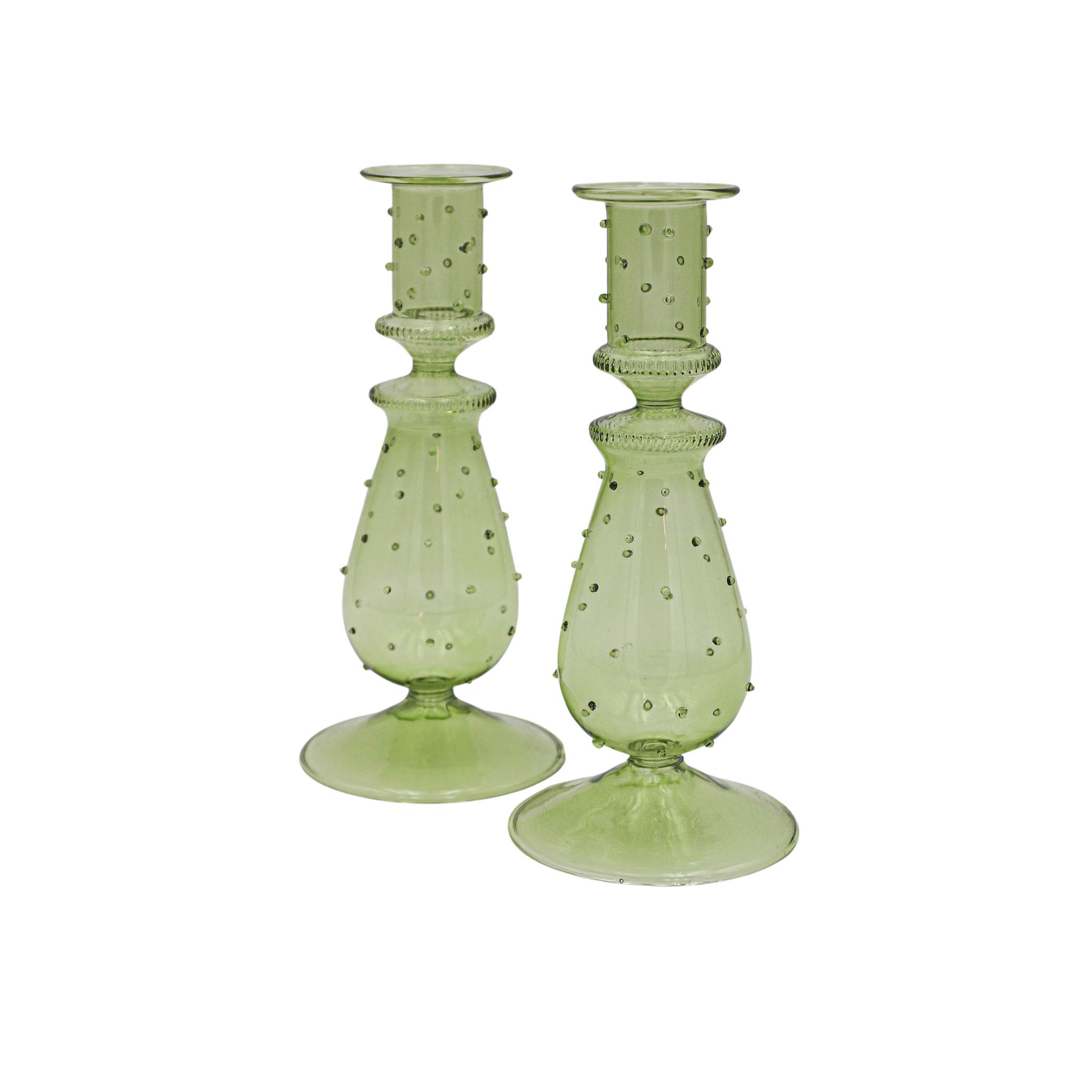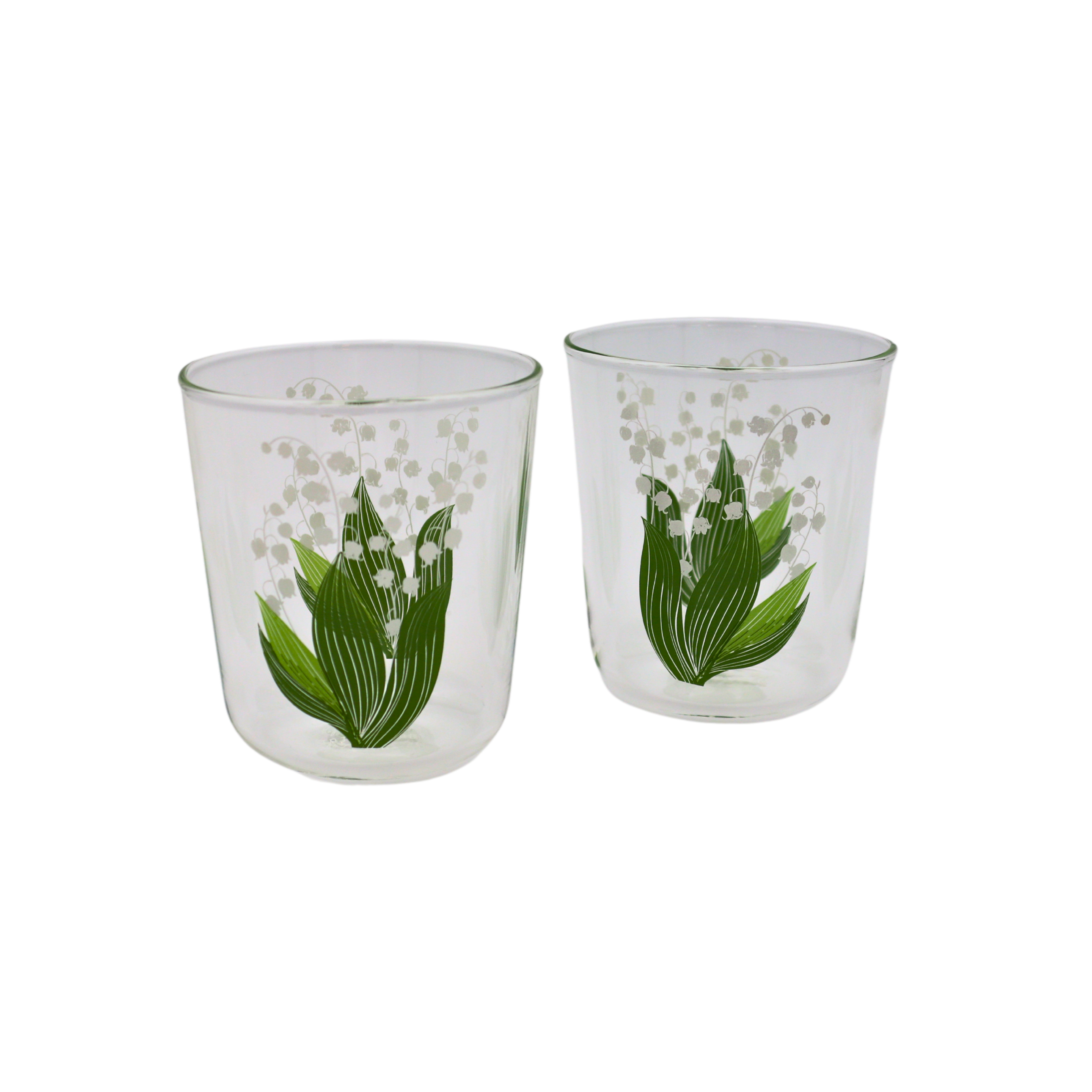 Amidst this pastoral setting, the Olive hand-blown fluted candle holders, speckled like morning dew on green leaves, add a whimsical light. Complement with the hand-painted Lily of the Valley Tumbler, that is a timeless favorite in English botanical illustrations.