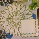 Our Olive Bloom Napkin is a perfect pairing for the Olive Bloom Placemat, featuring a simple scalloped edge with a double trim.