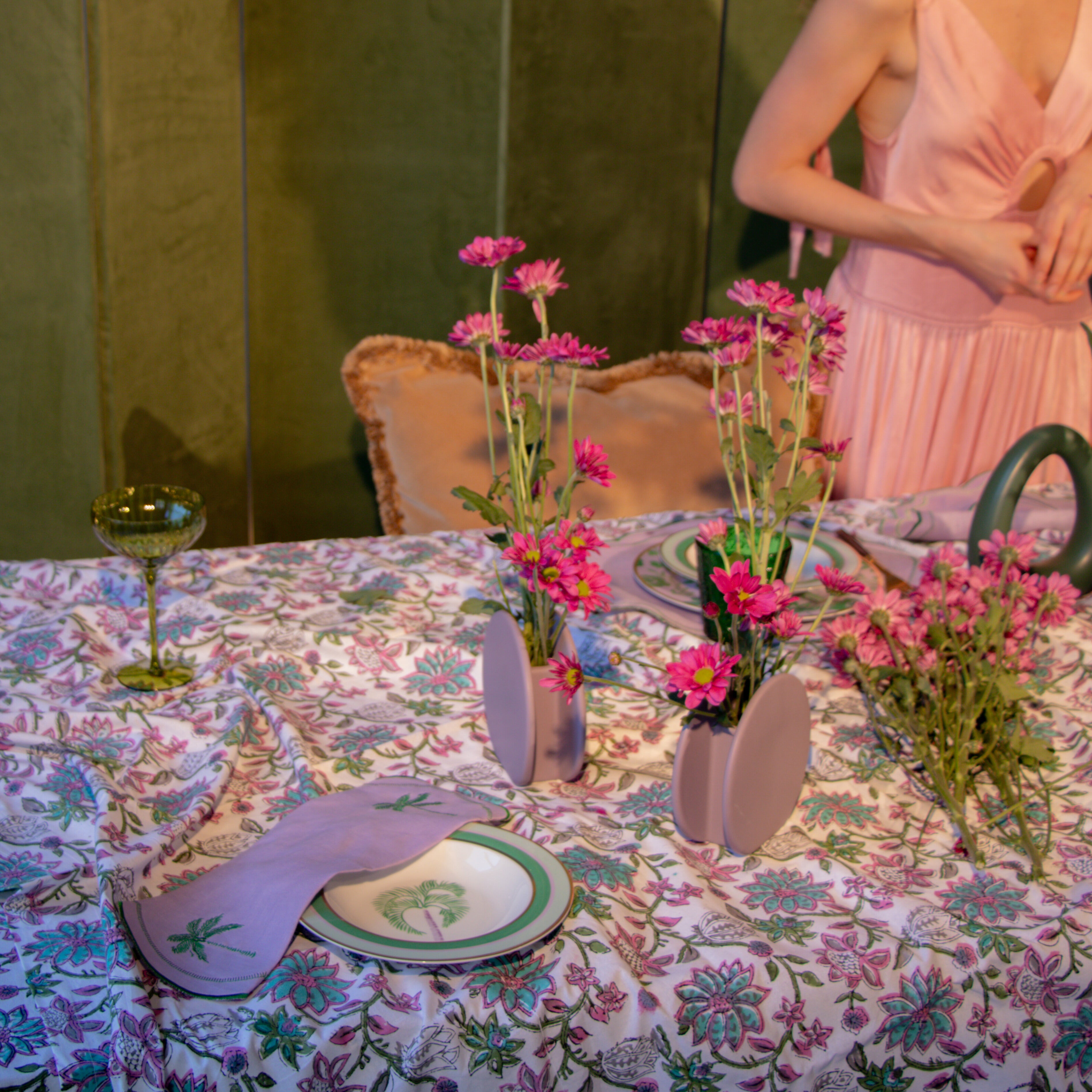 Indulge in the opulence of a bygone era with our Jewelled Mirage Napkin. Exquisitely crafted from lilac linen with emerald green embroidered edging and palm tree motifs on either side. Pair it seamlessly with our coordinating tableware to curate a captivating setting that transports you to a bygone era of timeless charm and the enchanting allure of our Vintage Palm collection