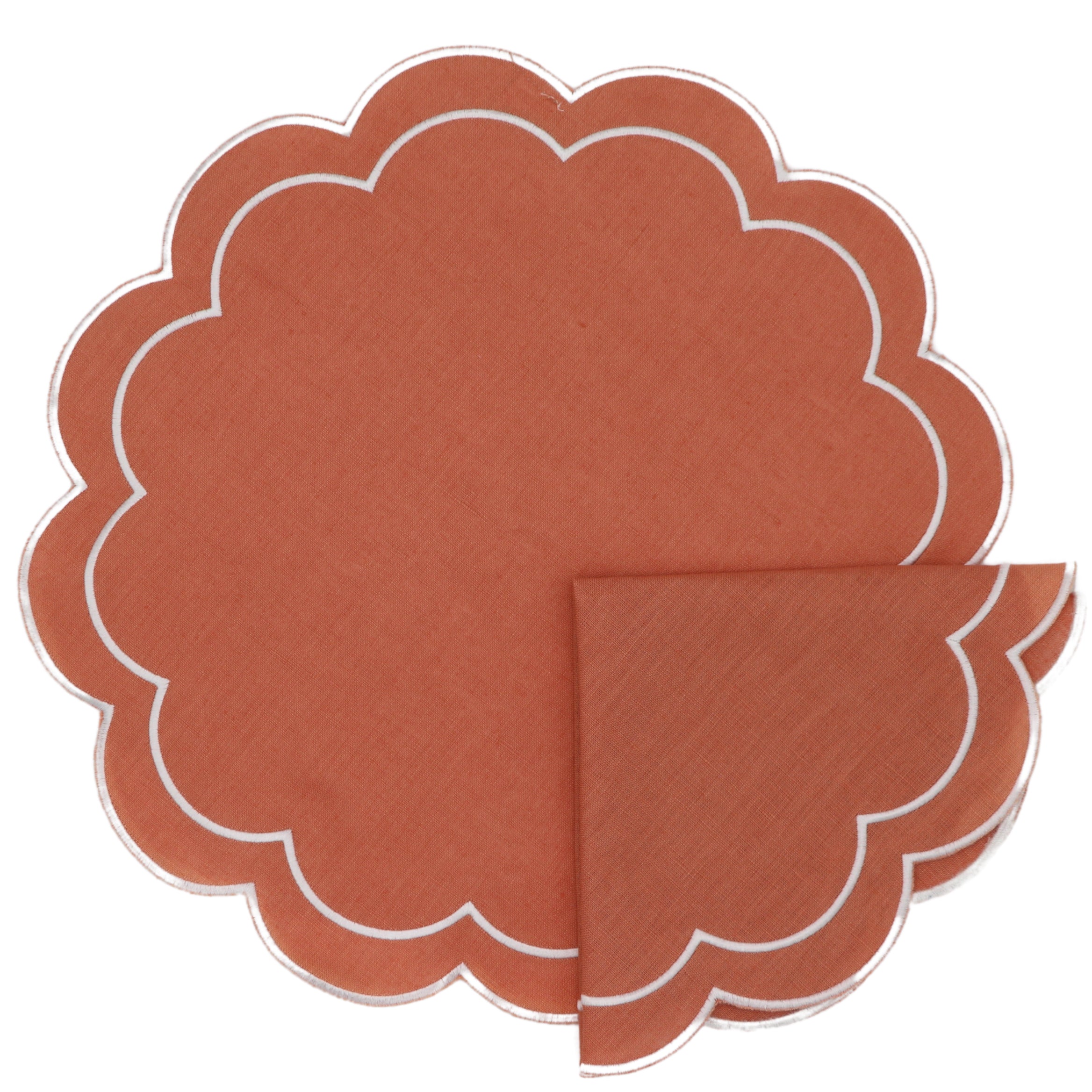 The simple salmon-pink linen placemat is edged with a white scalloped trim and inner embroidery. Pair it with our coordinating tableware to create an enchanting setting
