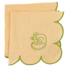 Step into the lush embrace of the Indian tropics with our Sunlit Moss Napkin from the Shimla Social Collection. Crafted from 100% yellow linen, adorned with a moss green embroidery of a playful monkey motif and a delicate scalloped trim. Pair it with our coordinating tableware from the Shimla Social collection