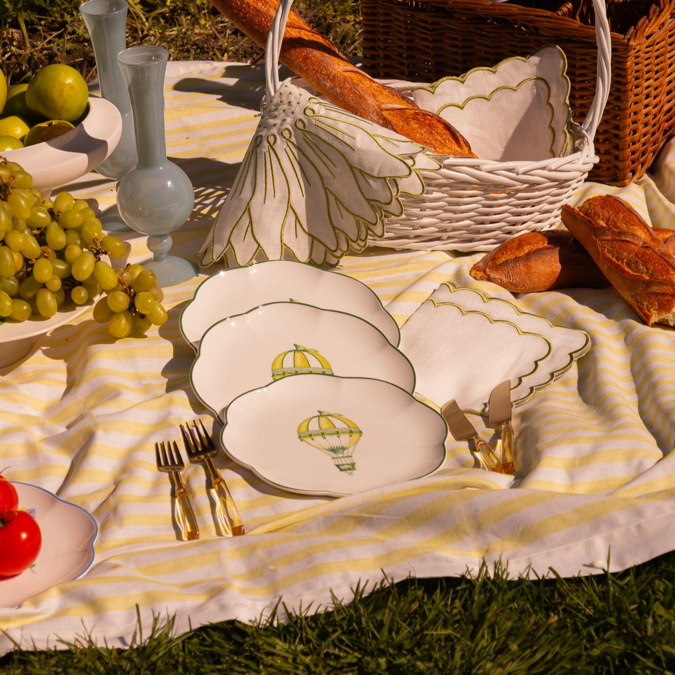 Unroll the jaunty yellow and white striped linen, reminiscent of the sunflower fields where Van Gogh might have shed a tear or two in awe. Its sunny stripes bring the light hearted joie de vivre straight to your table, setting the stage for tales of rural escapades and a glass or two of pastis.