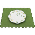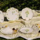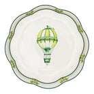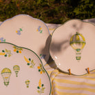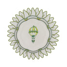 The Valensole Lavender Starter Plate encapsulates the essence of a dreamy afternoon in Provence with varying-sized hand-drawn hot air balloons in green and yellow hues with a muted green scalloped rim. Surrounding the edge, sprigs of yellow blossoms punctuated with verdant leaves evoke memories of the sun-kissed lavender fields of Valensole, reminiscent of lazy afternoons in the French countryside.