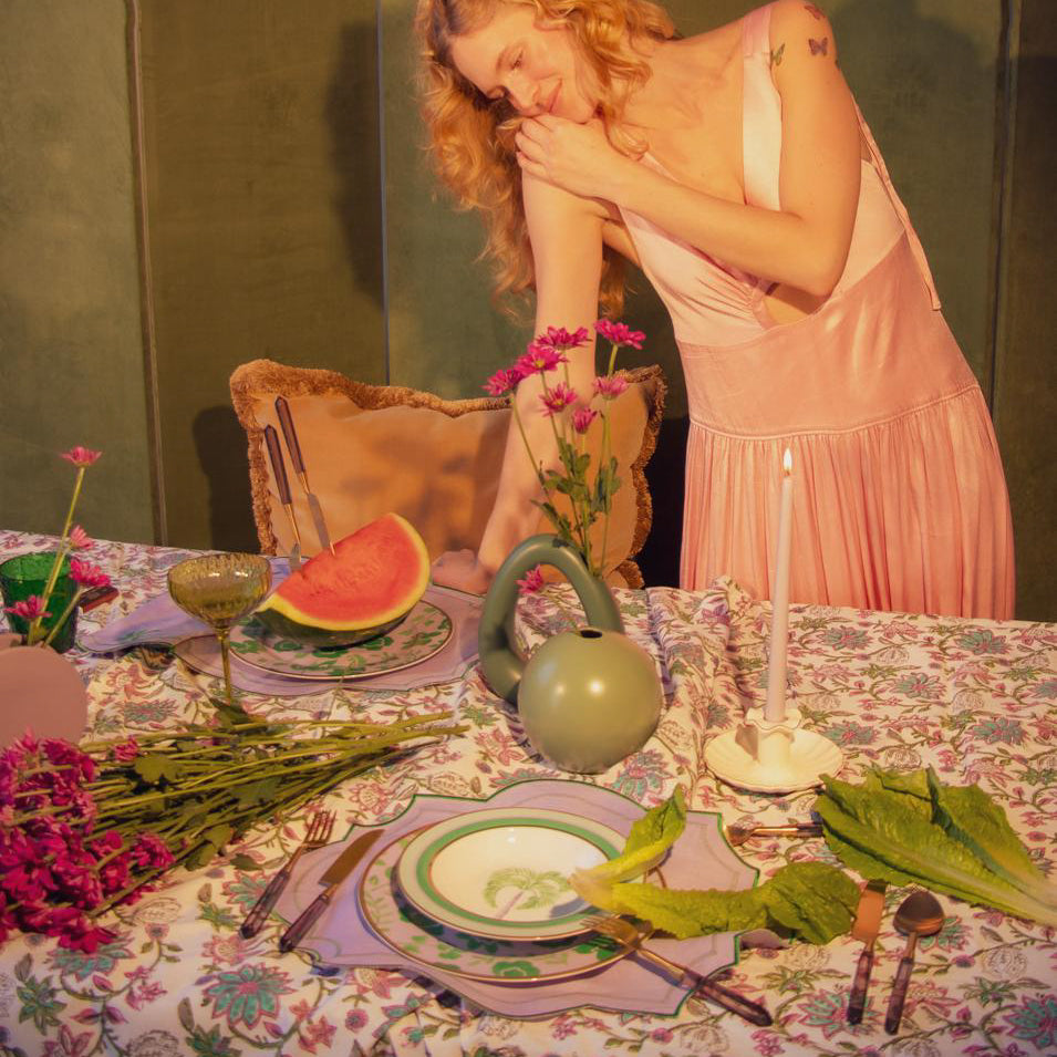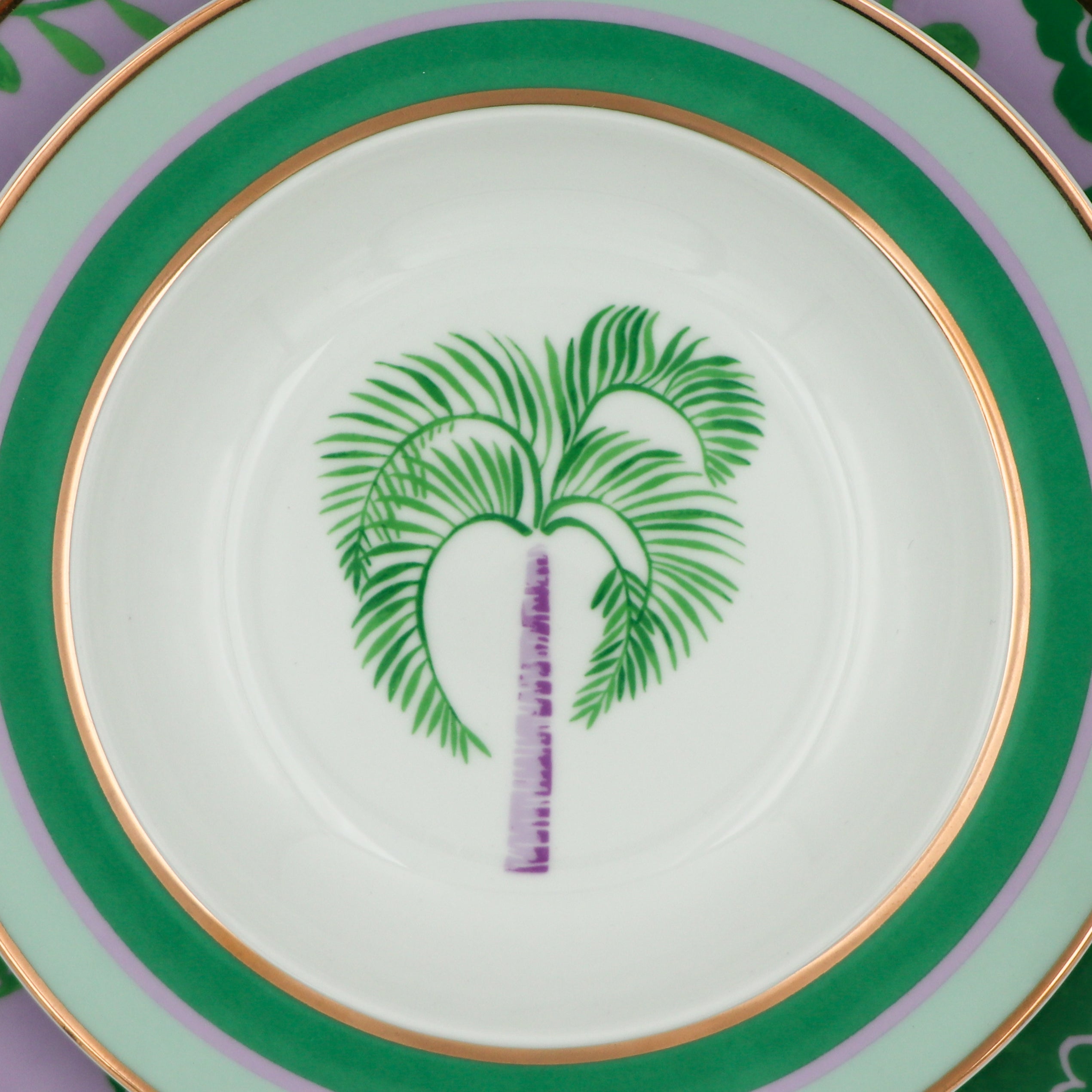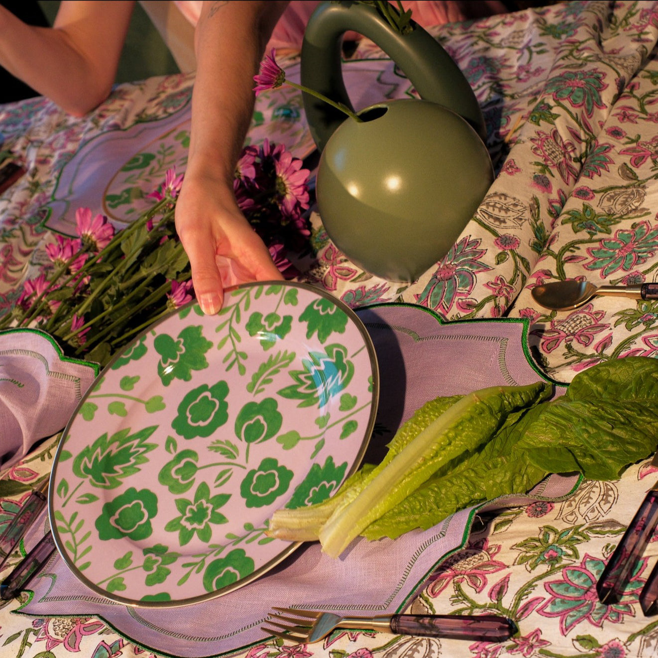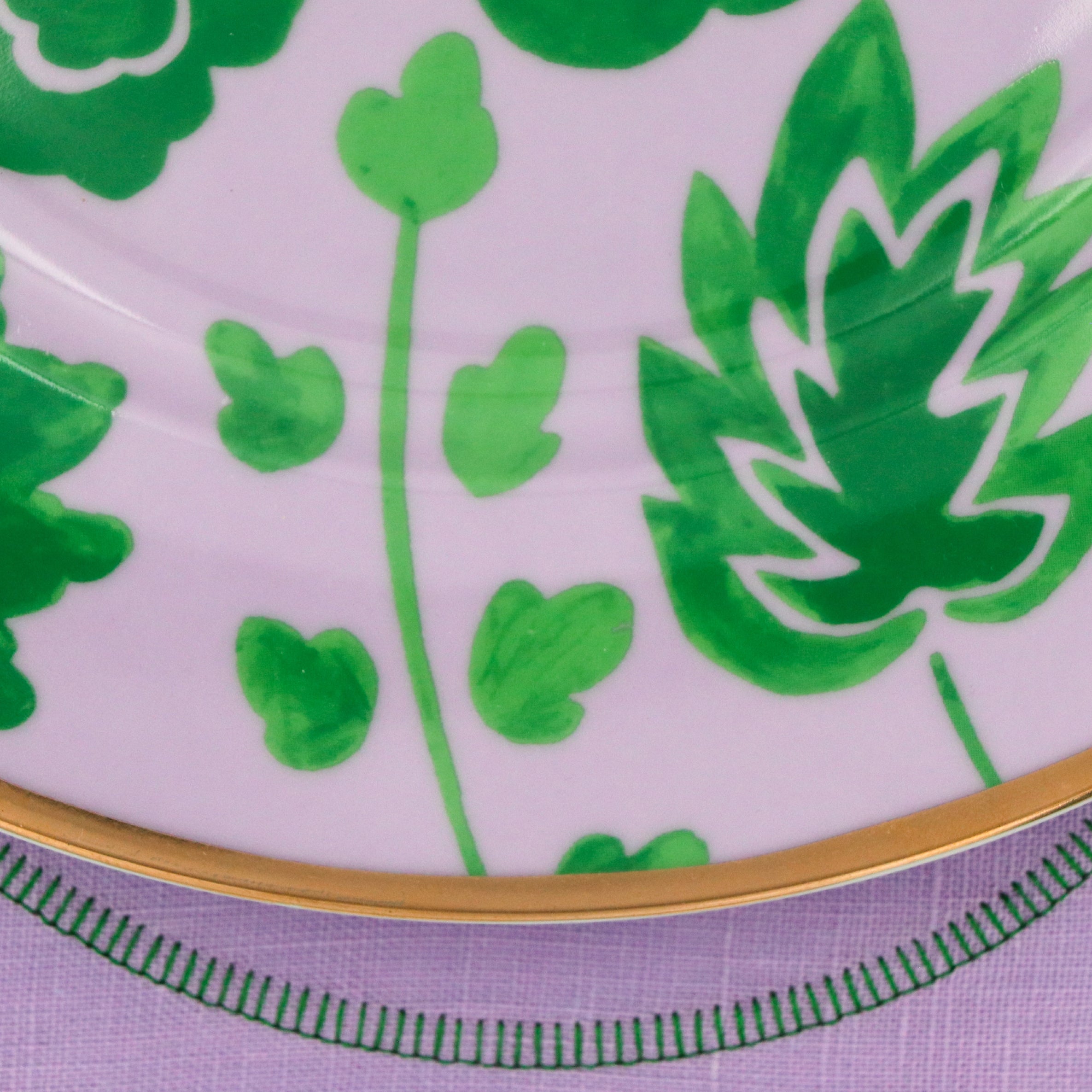 The Bernadette Leaf Dinner Plate in pastel lavender with hand-drawn green blooms set the stage, perfectly paired with the Bernadette Palm Soup Bowl.