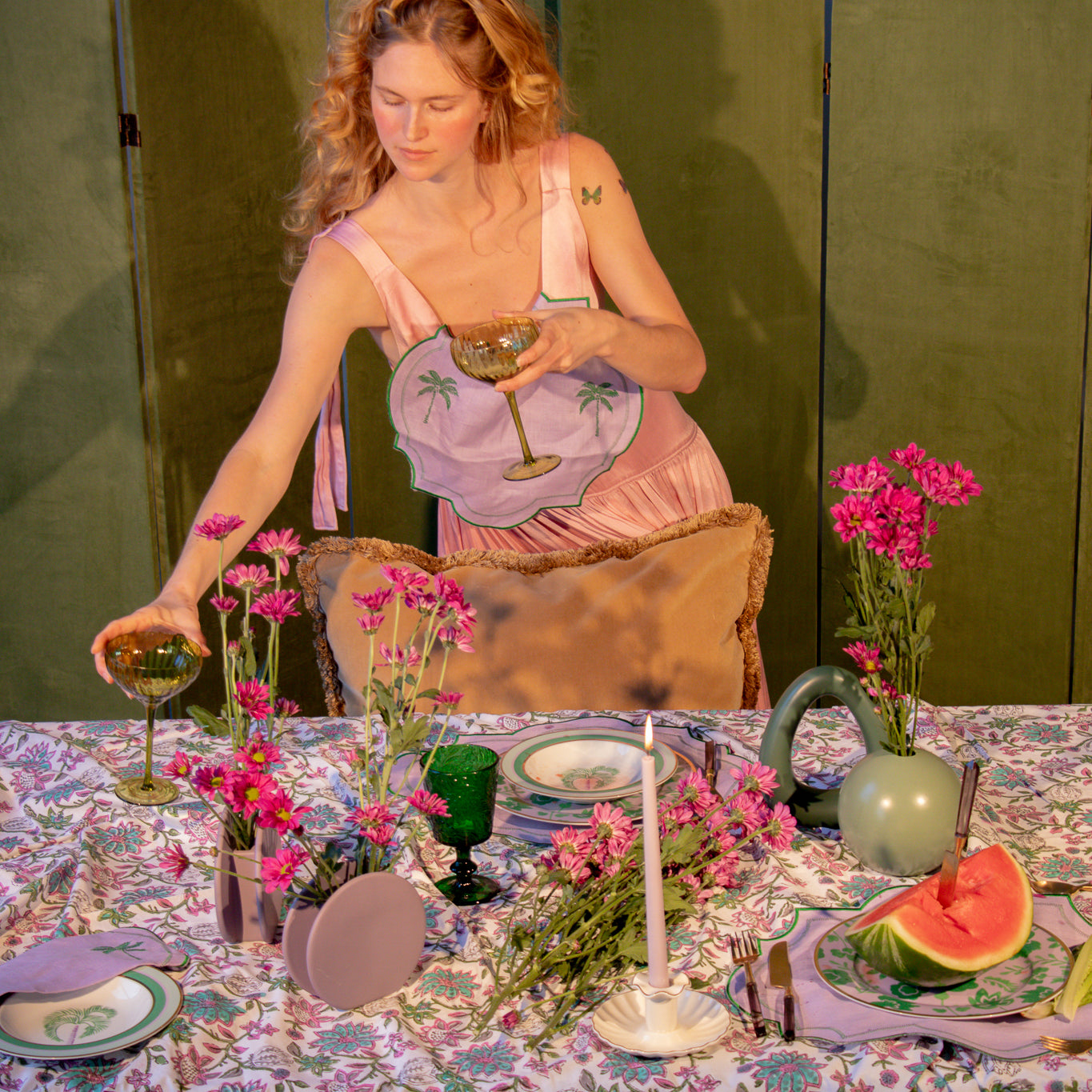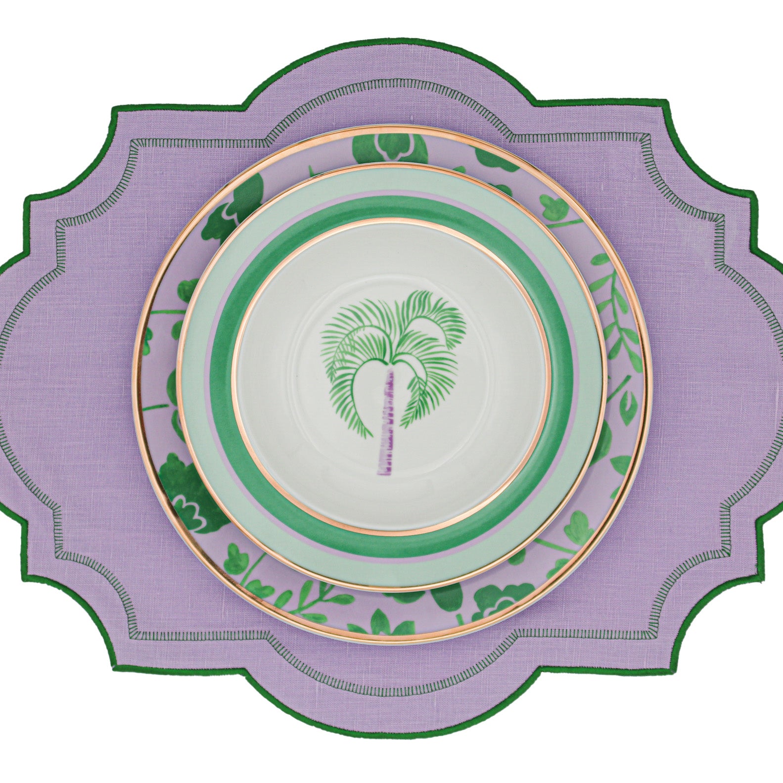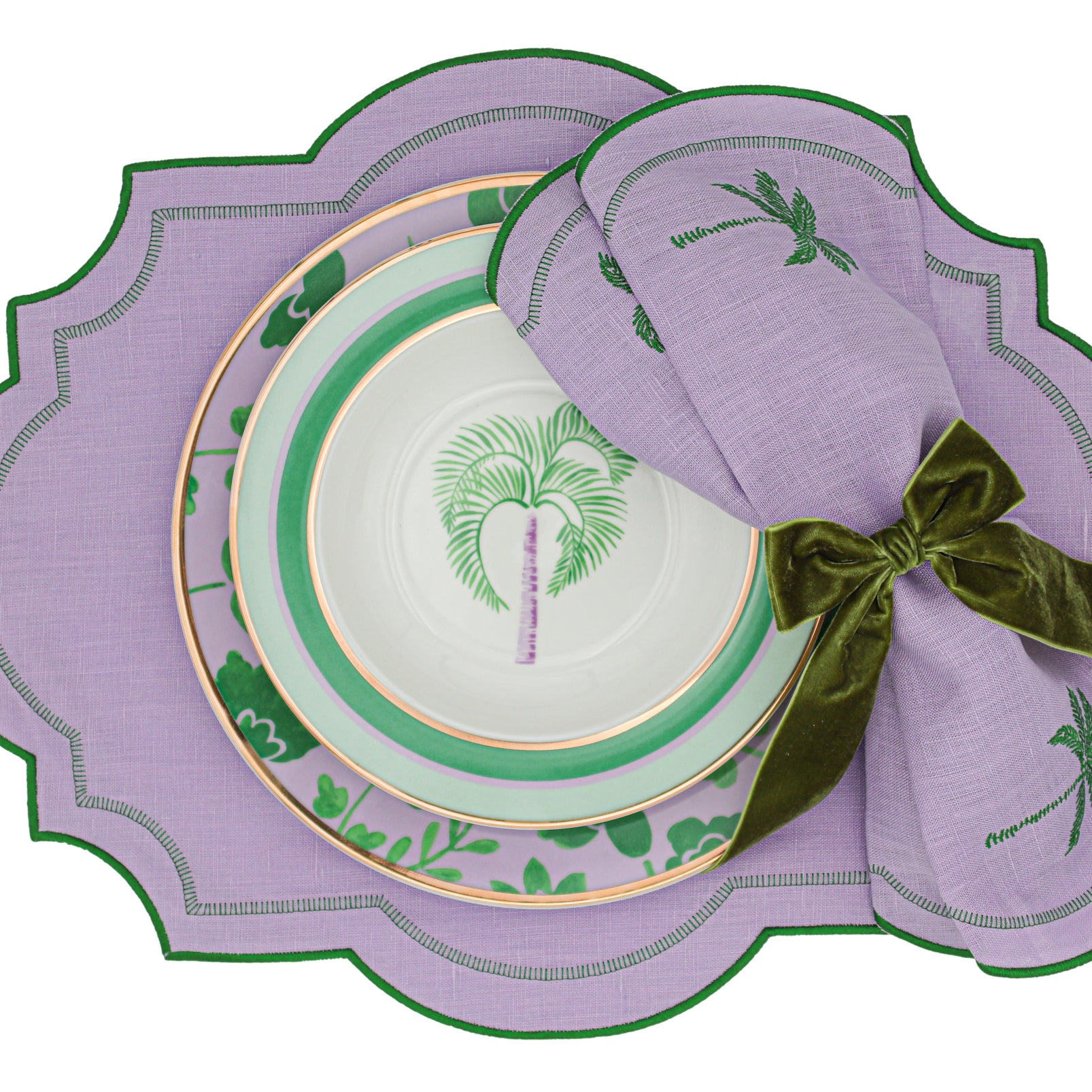 The Jewelled Mirage Placemats and Napkins are crafted from lilac linen and edged with emerald green embroidery. Each piece flaunts a palm tree motif, infusing your table with a fresh tropical vibe.
