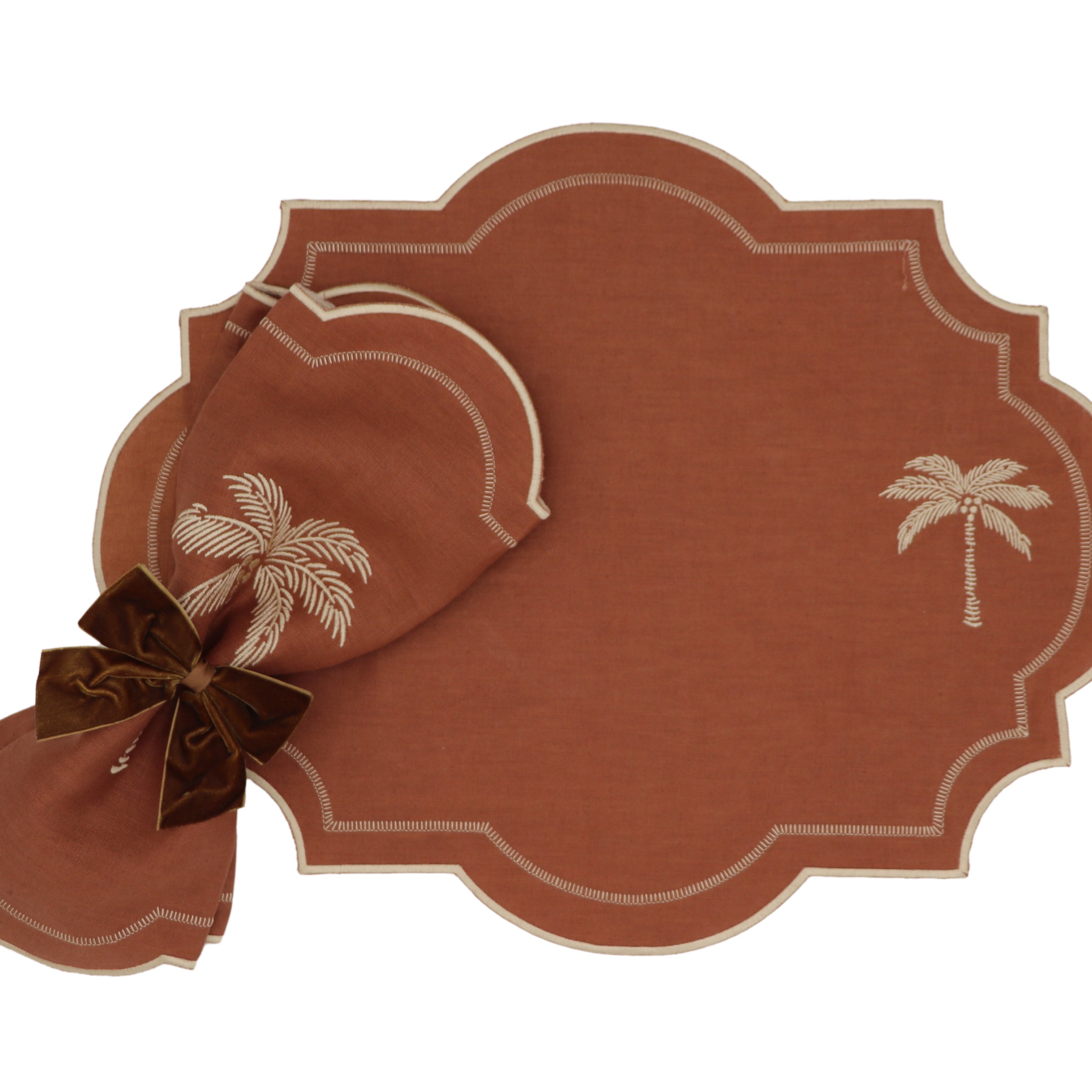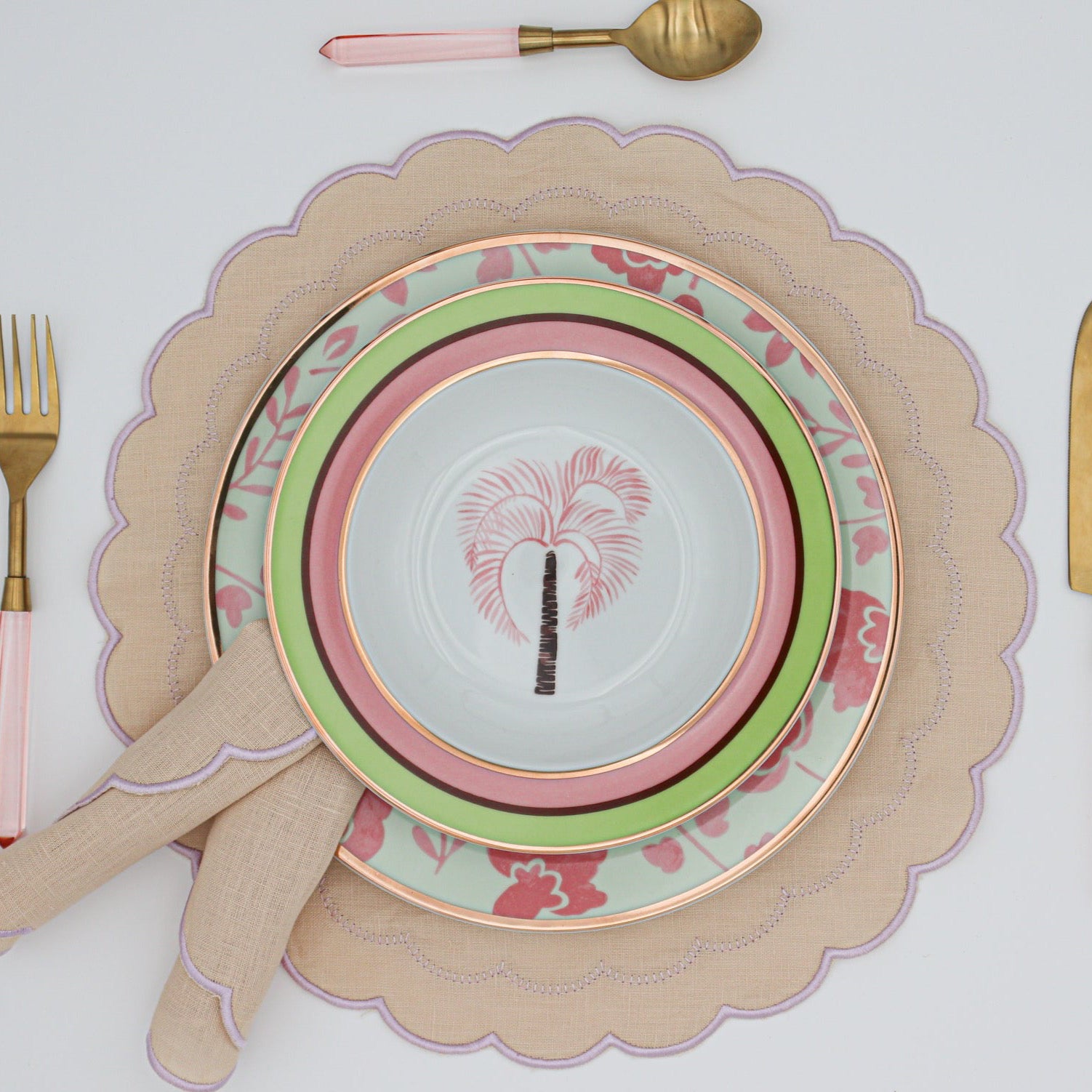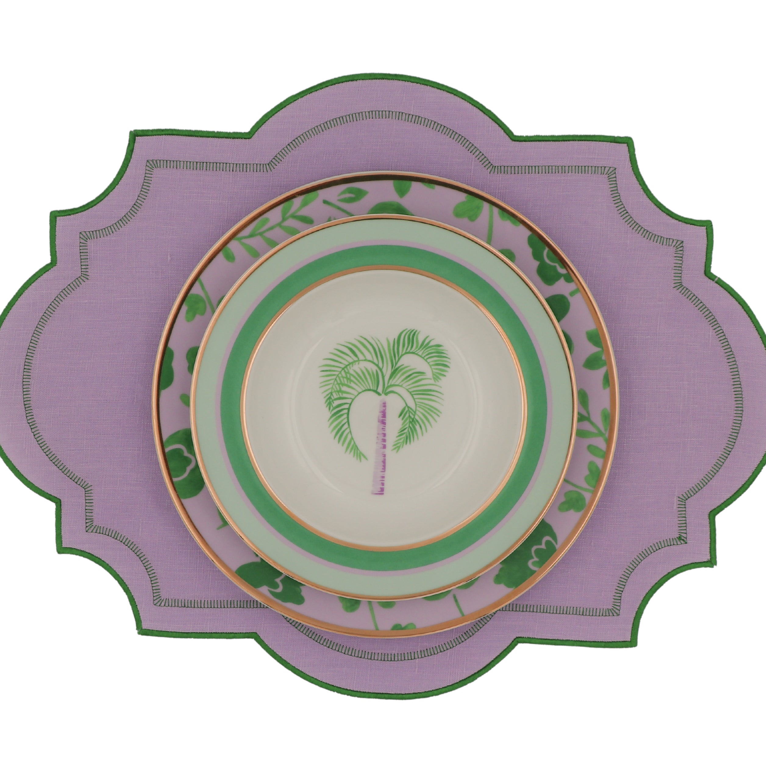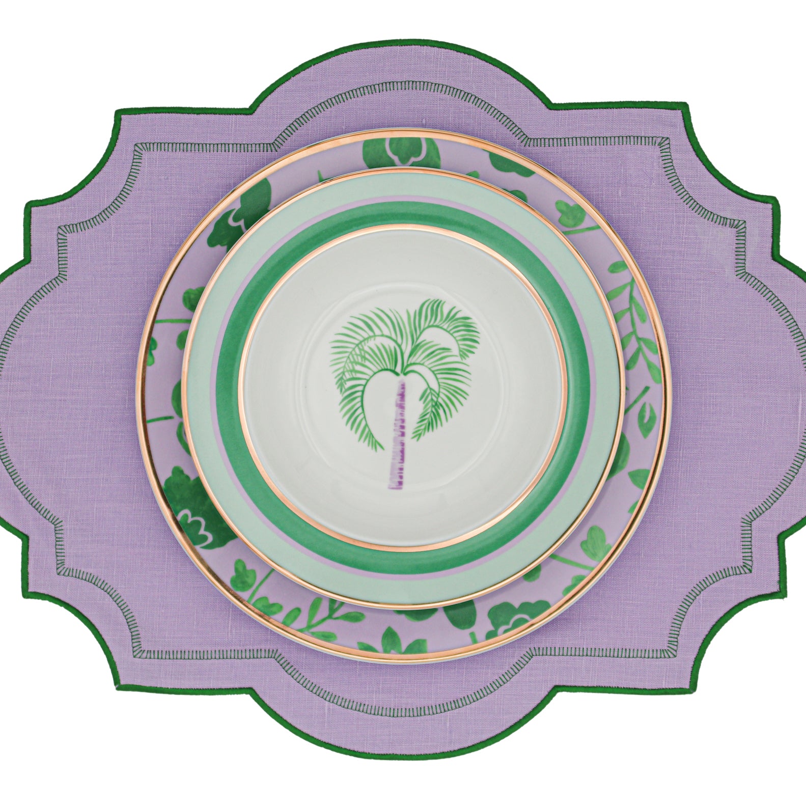 The Jewelled Mirage Placemats and Napkins are crafted from lilac linen and edged with emerald green embroidery. Each piece flaunts a palm tree motif, infusing your table with a fresh tropical vibe.