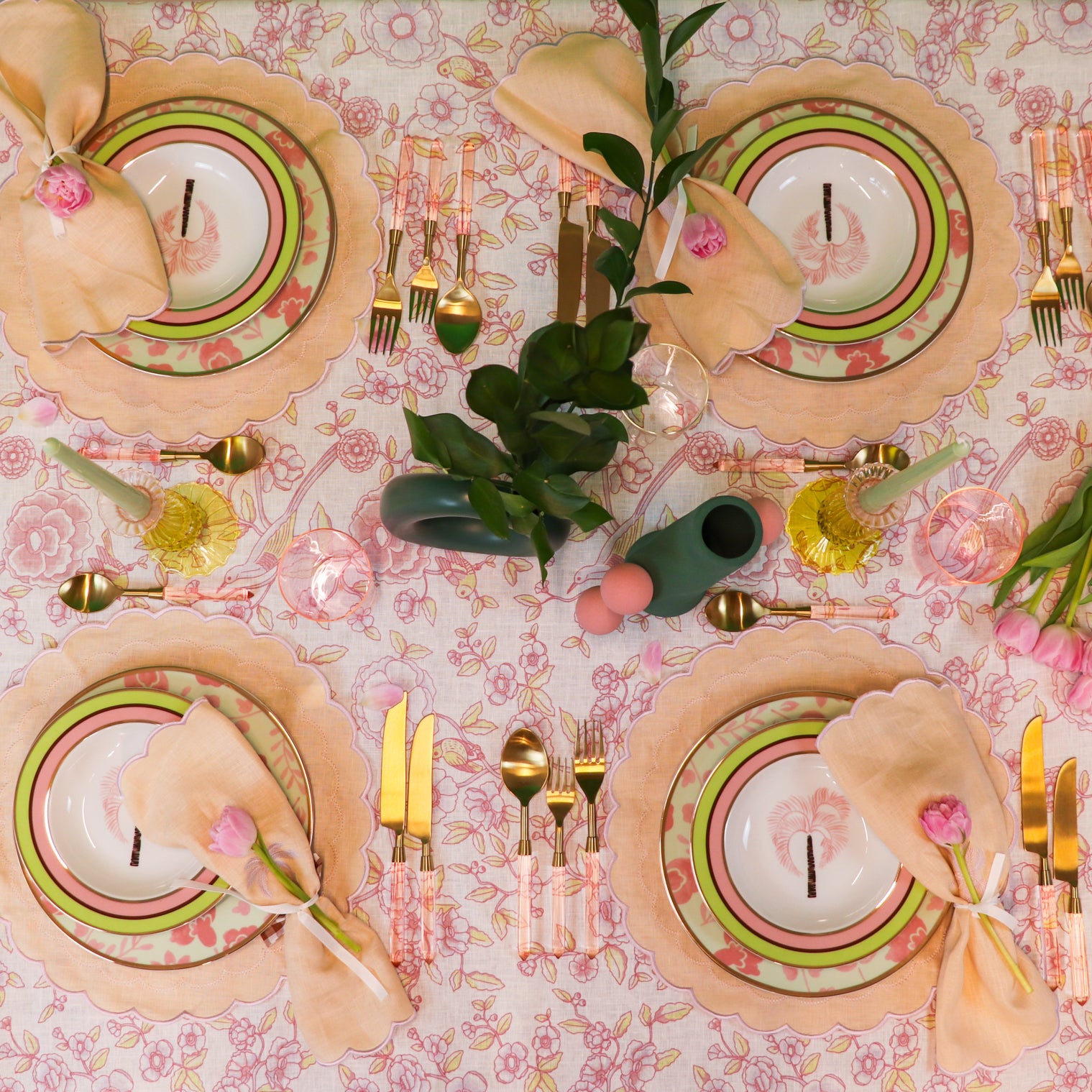 Enter the realm of the Vintage Palm Soiree collection, channeling the spirit of resort retreat. Style your table with lilac and emerald dinnerware, evoking Palm Beach vibes. Add palm frond centerpieces and vintage glassware to create a chic, resort-like atmosphere with a touch of exotic allure.
