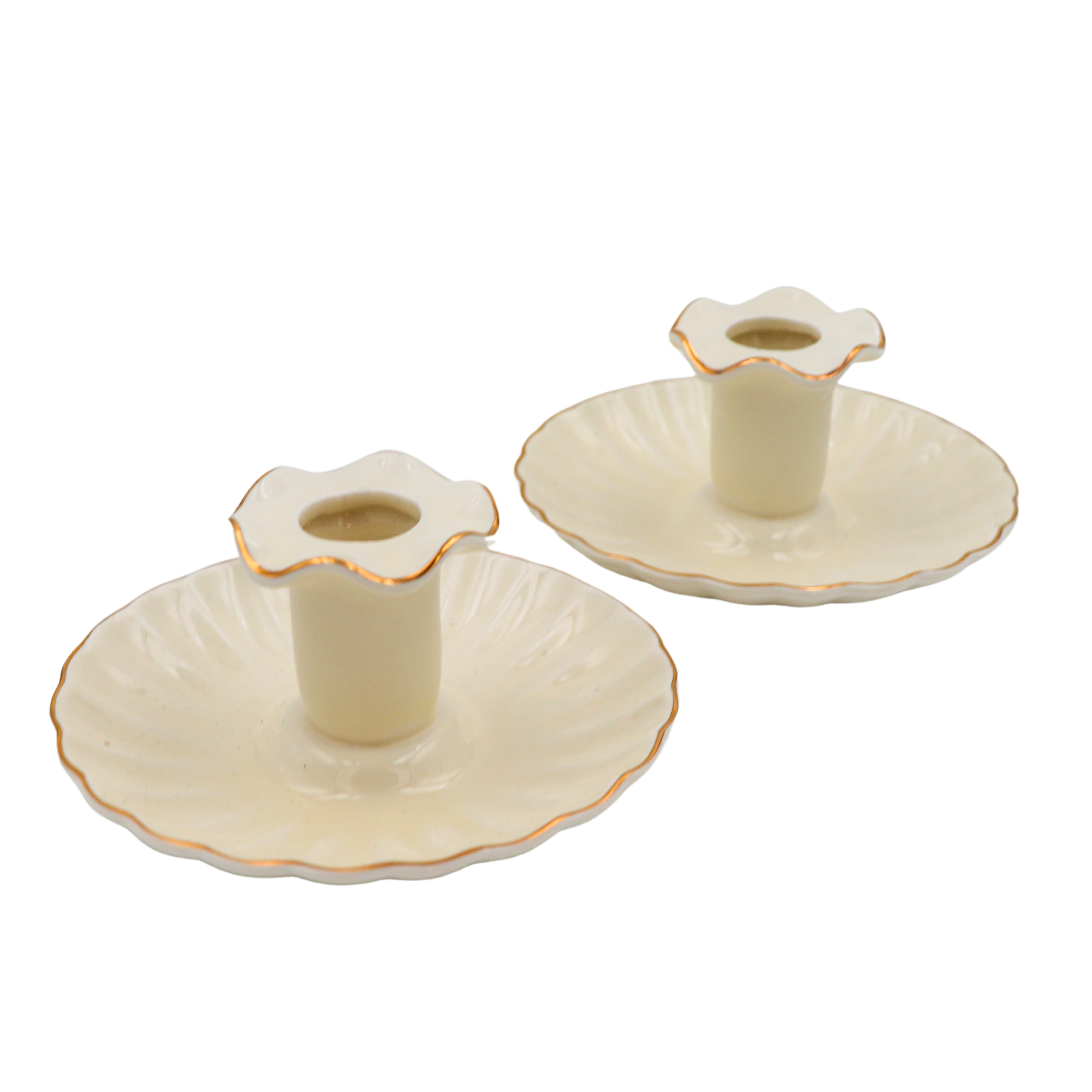 The cream ceramic candle holder, with its fluted design and gold-trimmed edges, casts a warm, inviting glow.