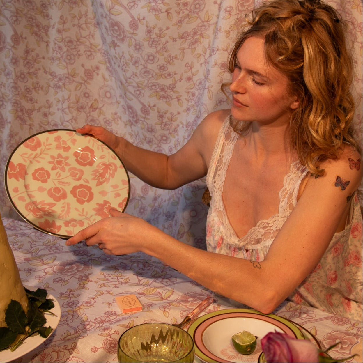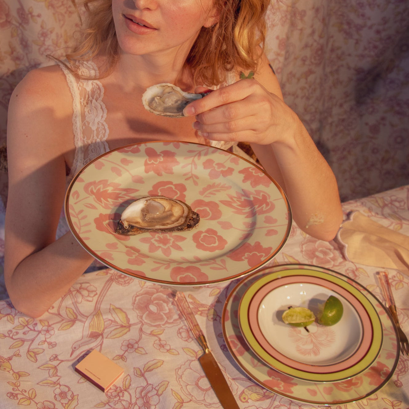 Step into a nostalgic coastal and desert rendezvous with our Pistachio & Lychee Palm Dinner Plate. Hand-drawn blooms and leaves in soothing blush shades, against a pastel pistachio sorbet shade that echoes the timeless allure of beach sunsets and sweeping desert landscapes. Designed for the contemporary soul who is forever young at heart. Encircled with a gold rim.